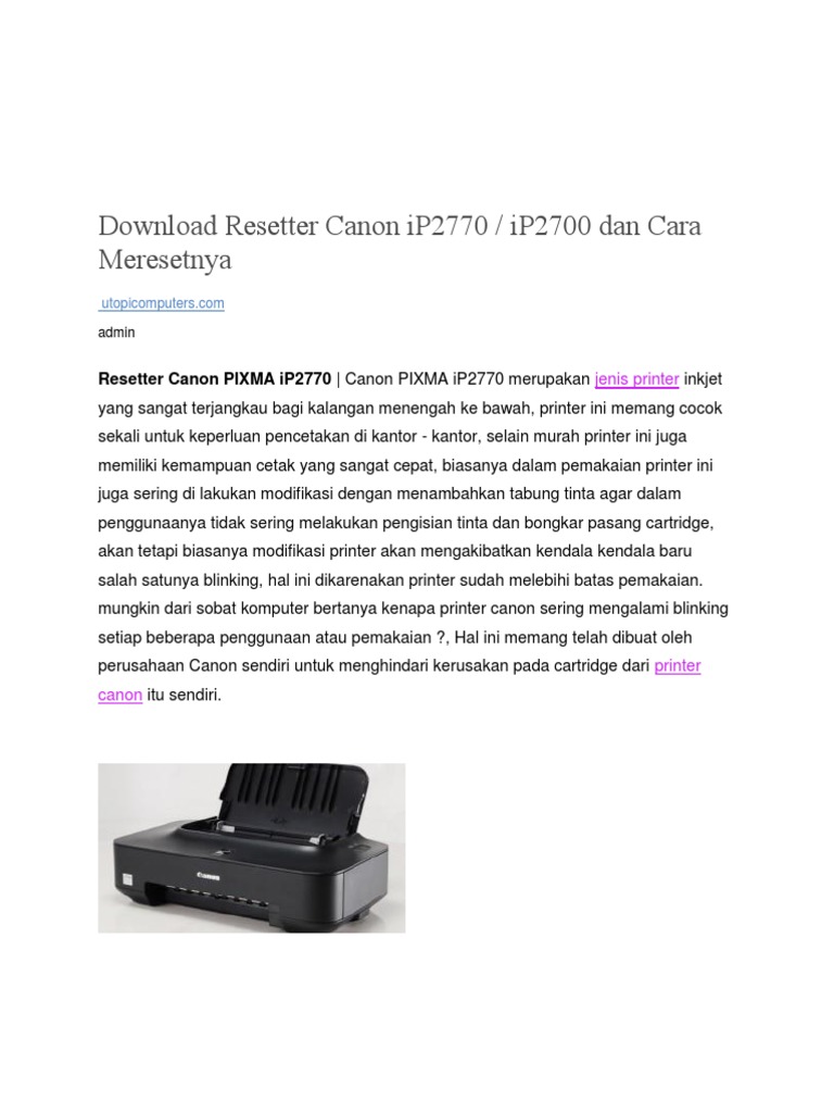 Lampu indikator yang berkedip sebanyak 4 kali warna orange dan 1 kali warna hijau, biasanya menandakan bagian pad tinta penuh atau waste ink pad full. Siapkan 2 kertas di printer (ini untuk print pada waktu proses reset). Jika printer canon ip2770 masih bergaransi sebaiknya dibawa ke pusat servis, jika. Jika anda masih bingun tentang cara reset printer canon ip2770, anda bisa memnacanya pada. Canon merupakan salah satu jenis printer yang paling banyak digunakan karena memiliki harga yang terjangkau dengan kualitas hasil cetak yang cukup bagus.